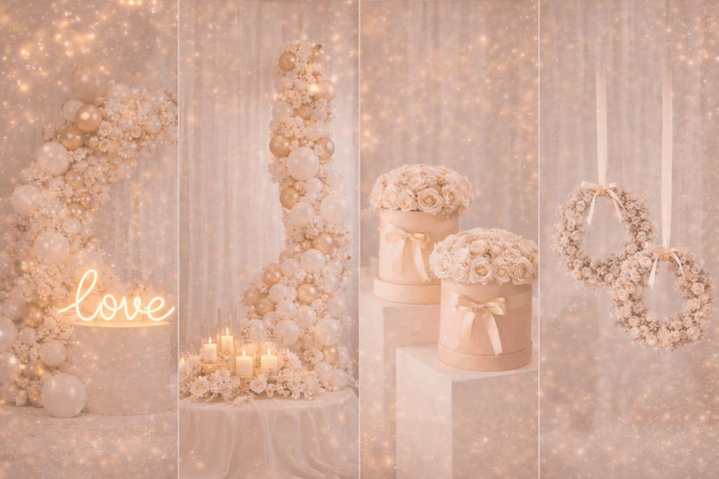 Oferujemy eleganckie dekoracje na każdą okazję – od wesel i urodzin, po jubileusze i eventy firmowe. Tworzymy wyjątkowe aranżacje, takie jak ścianki dekoracyjne, girlandy balonowe, flower boxy oraz wianki, które nadają wydarzeniu niepowtarzalny klimat.